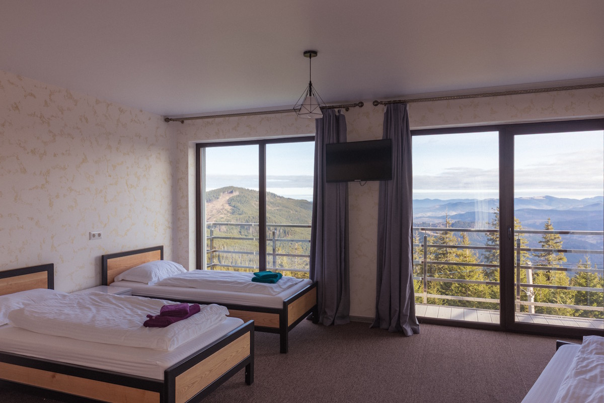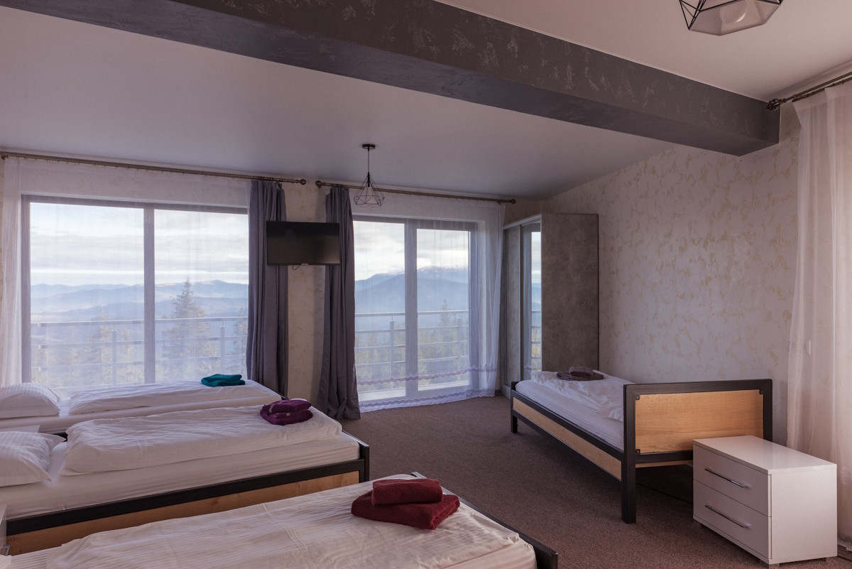 Чотирьохмісний номер з балконом та панорамним видом на гірський масив Чорногора. У номері чотири односпальних ліжка.